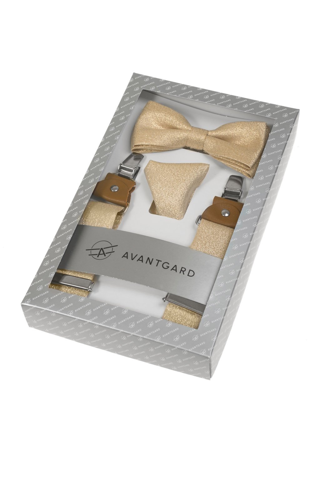 Set Látkové šle Y s koženým středem a zapínáním na klipy - 35 mm, motýlek a kapesníček, materiál 100% polyester + 80 % polyester, 10 % polyamid, 10 % elastan + pravá kůže, zlatá