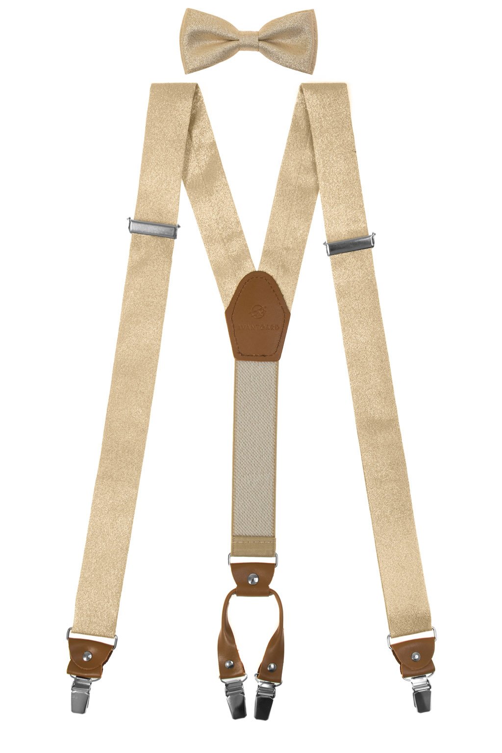 Set Látkové šle Y s koženým středem a zapínáním na klipy - 35 mm, motýlek a kapesníček zlatá, koňaková kůže 886-8139569
