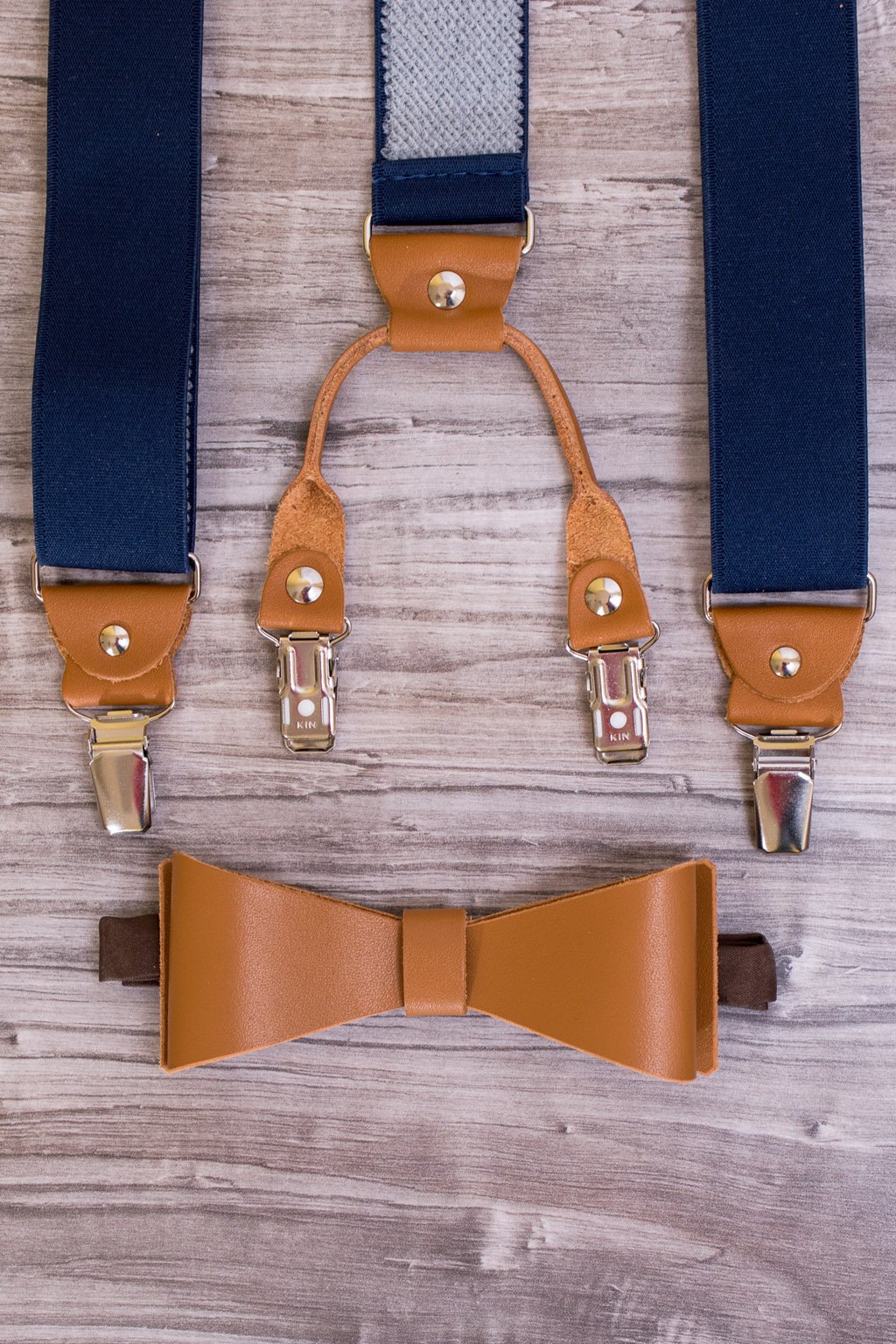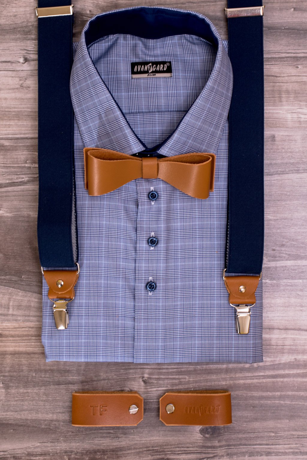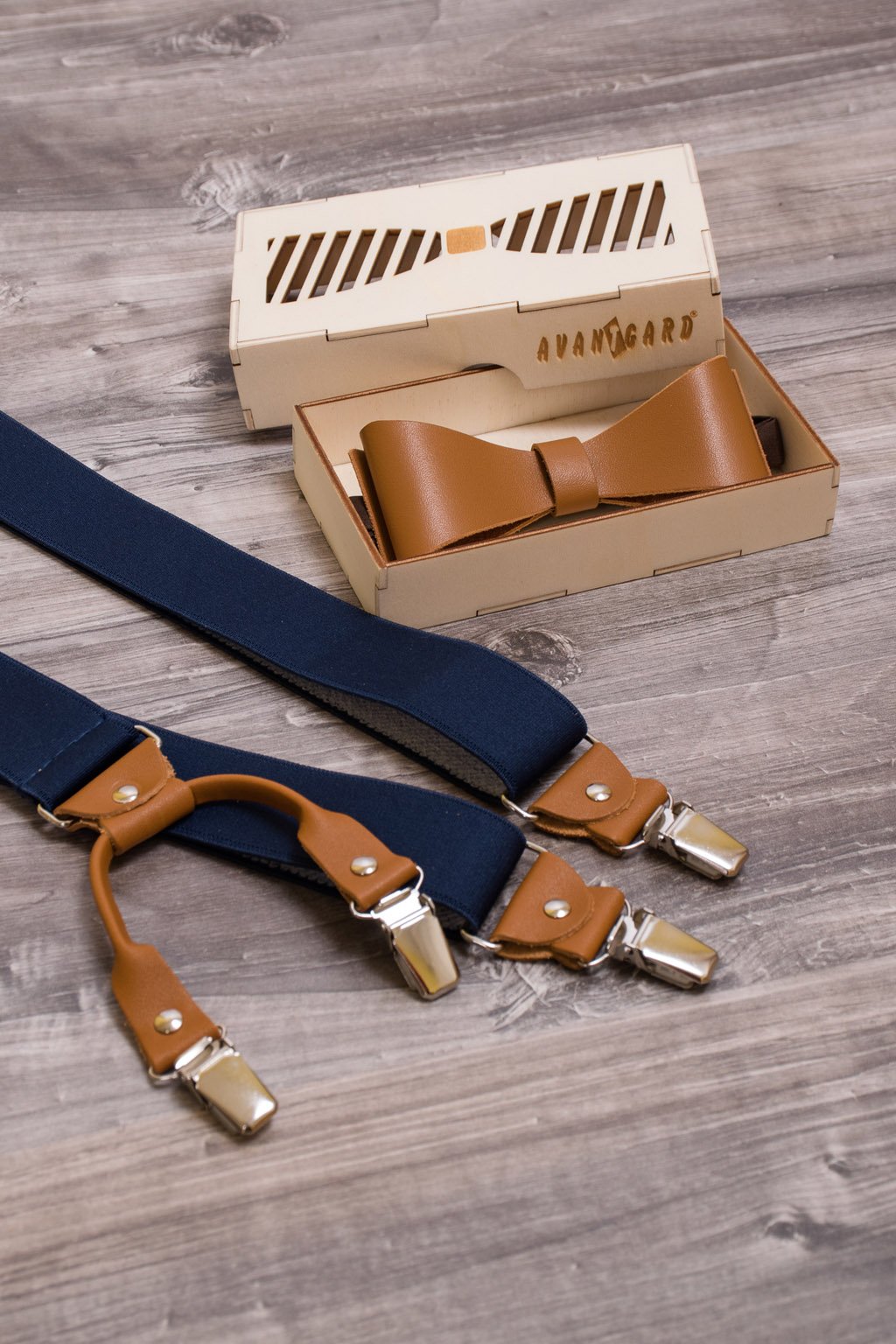 Šle Y s koženým středem a zapínáním na klipy - 35 mm tmavě modrá, koňaková kůže 880-3169